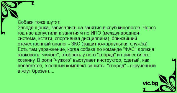 Тут выходит молодая девушка с со здоровенным кобелём. Тот в предвкушении начинает рыть землю, страшно рычит. Раздаётся команда, пёс срывается с места и бежит, но не к инструктору, а к его помощнику, который по причине тёплой погоды был в шортах и майке. Парень резко побелел и начал озираться в поисках возможного укрытия. В это время кобель, подлетев к нему с угрожающим рычанием, резко затормозил, сел на попу, сказал негромко "гав" и, видимо удовлетворившись произведённым эффектом, помчался уже к инструктору за "снарядом".