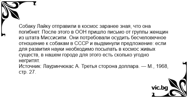 Собаку Лайку отправили в космос заранее зная, что она погибнет. После этого в ООН пришло письмо от группы женщин из штата Миссисипи. Они потребовали осудить бесчеловечное отношение к собакам в СССР и выдвинули предложение: если для развития науки необходимо посылать в космос живых существ, в нашем городе для этого есть сколько угодно негритят.