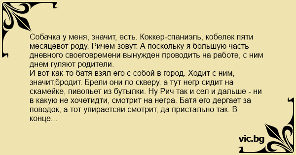 И вот как-то батя взял его с собой в город. Ходит с ним, значит,бродит. Брели они по скверу, а тут нeгp сидит на скамейке, пивопьет из бутылки. Ну Рич так и сел и дальше - ни в какую не хочетидти, смотрит на негра. Батя его дергает за поводок, а тот упираетсяи смотрит, да пристально так. В конце концов нeгp не выдержал,да и говорит (без акцента, студент, наверное):