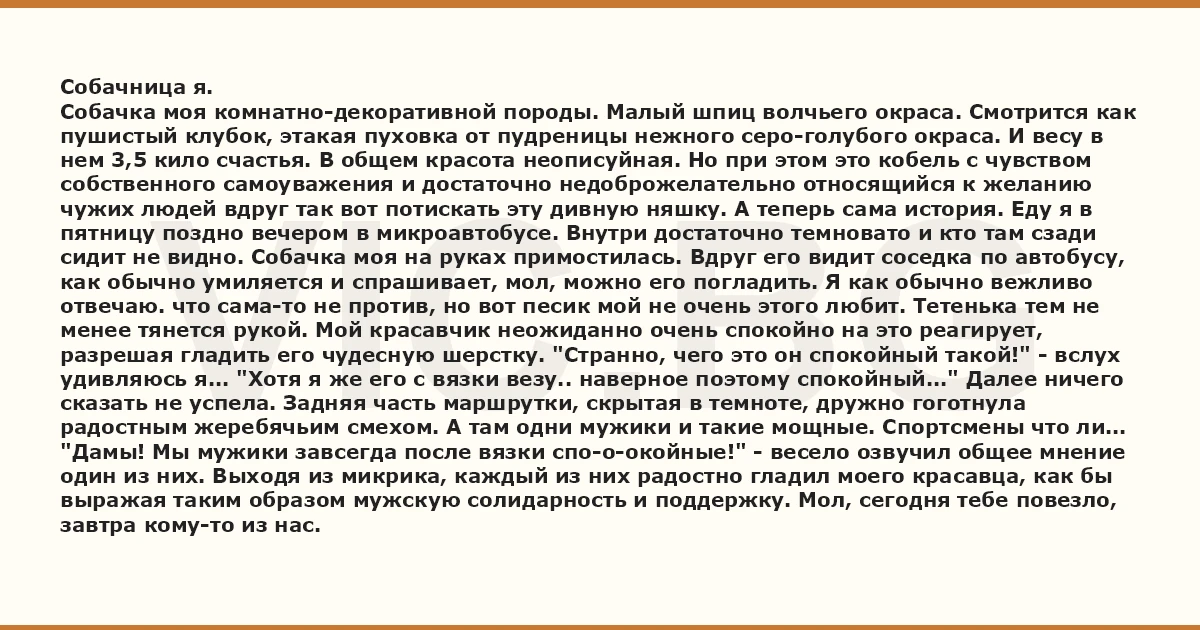 Собачка моя комнатно-декоративной породы. Малый шпиц волчьего окраса. Смотрится как пушистый клубок, этакая пуховка от пудреницы нежного серо-голубого окраса. И весу в нем 3,5 кило счастья. В общем красота неописуйная. Но при этом это кобель с чувством собственного самоуважения и достаточно недоброжелательно относящийся к желанию чужих людей вдруг так вот потискать эту дивную няшку. А теперь сама история. Еду я в пятницу поздно вечером в микроавтобусе. Внутри достаточно темновато и кто там сзади сидит не видно. Собачка моя на руках примостилась. Вдруг его видит соседка по автобусу, как обычно умиляется и спрашивает, мол, можно его погладить. Я как обычно вежливо отвечаю. что сама-то не против, но вот песик мой не очень этого любит. Тетенька тем не менее тянется рукой. Мой красавчик неожиданно очень спокойно на это реагирует, разрешая гладить его чудесную шерстку. "Странно, чего это он спокойный такой!" - вслух удивляюсь я... "Хотя я же его с вязки везу.. наверное поэтому спокойный..." Далее ничего сказать не успела. Задняя часть маршрутки, скрытая в темноте, дружно гоготнула радостным жеребячьим смехом. А там одни мужики и такие мощные. Спортсмены что ли... "Дамы! Мы мужики завсегда после вязки спо-о-окойные!" - весело озвучил общее мнение один из них. Выходя из микрика, каждый из них радостно гладил моего красавца, как бы выражая таким образом мужскую солидарность и поддержку. Мол, сегодня тебе повезло, завтра кому-то из нас.