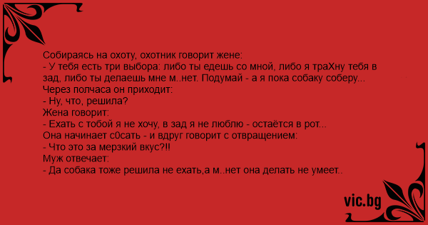 - У тебя есть три выбора: либо ты едешь со мной, либо я тpaXну тебя в зад, либо ты делаешь мне м..нeт. Подумай - а я пока собаку соберу...