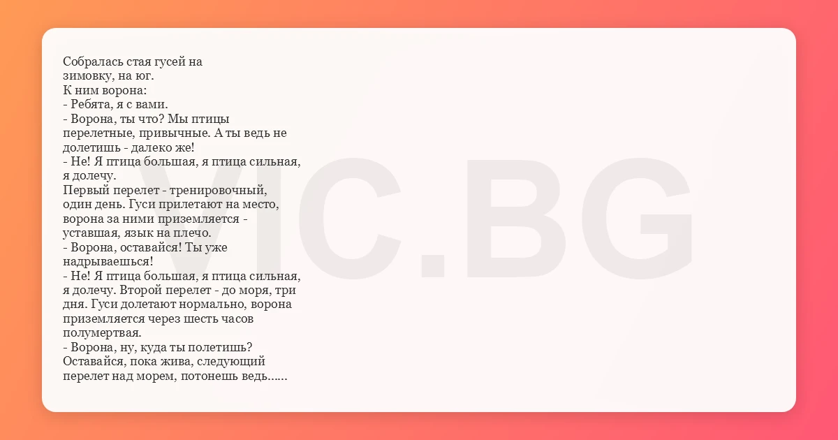 Собралась стая гусей на зимовку, на юг. К ним ворона: - Ребята, я с вами. - Ворона, ты что? Мы птицы перелетные, привычные. А ты ведь не долетишь - далеко же! - Не! Я птица большая, я птица сильная, я долечу. Первый перелет - тренировочный, один день. Гуси прилетают на место, ворона за ними приземляется - уставшая, язык на плечо. - Ворона, оставайся! Ты уже надрываешься! - Не! Я птица большая, я птица сильная, я долечу. Второй перелет - до моря, три дня. Гуси долетают нормально, ворона приземляется через шесть часов полумертвая. - Ворона, ну, куда ты полетишь? Оставайся, пока жива, следующий перелет над морем, потонешь ведь... - Я птица большая, я птица сильная, я долечу... Третий перелет над морем - семь дней. В первый же день ворона безнадежно отстает. В срок гуси приземляются за морем. Вороны, понятное дело, нет. Подождали ее пару дней, помянули бедняжку добрым словом, только собрались лететь на место, видят: над горизонтом точка. Ворона. Летит буквой "зю", вслепую, не разбирая ни дороги, ни направления, почти касаясь воды. Долетает до песочка и падает пластом. Гуси подбегают к ней и радуются: - Ворона! Ты молодец! Ты большая! Ты сильная! Ты крутая! Ты долетела! Ворона поднимает голову: - Да, я долетела... Да, я большая... Да, я сильная... НО НА ГОЛОВУ БОЛЬНАЯ...