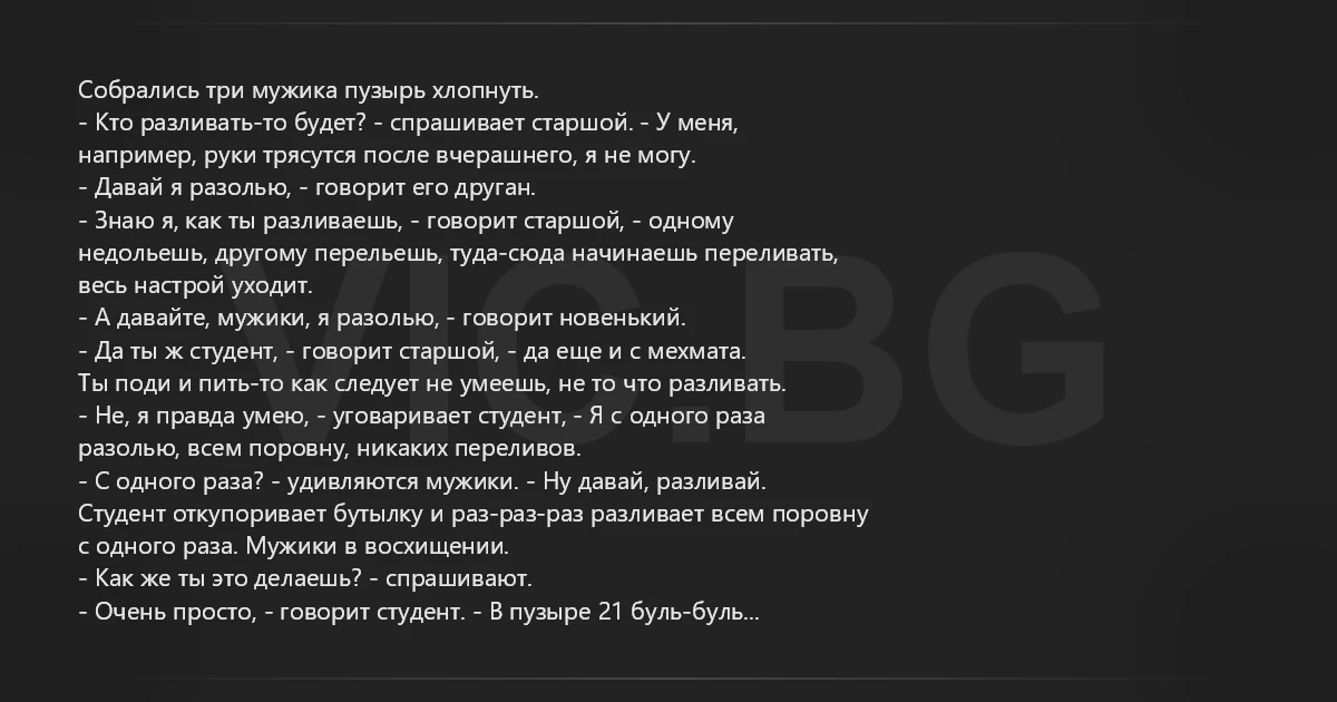 Студент откупоривает бутылку и раз-раз-раз разливает всем поровну