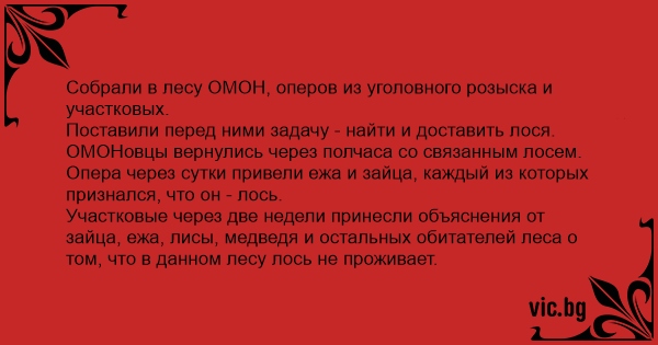 Собрали в лесу ОМОН, оперов из уголовного розыска и участковых. Поставили перед ними задачу - найти и доставить лося. ОМОНовцы вернулись через полчаса со связанным лосем. Опера через сутки привели ежа и зайца, каждый из которых признался, что он - лось. Участковые через две недели принесли объяснения от зайца, ежа, лисы, медведя и остальных обитателей леса о том, что в данном лесу лось не проживает.