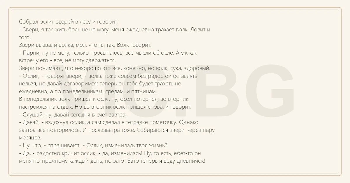 Собрал ослик зверей в лесу и говорит: - Звери, я так жить больше не могу, меня ежедневно трахает волк. Ловит и того. Звери вызвали волка, мол, что ты так. Волк говорит: - Парни, ну не могу, только просыпаюсь, все мысли об осле. А уж как встречу его - все, не могу сдержаться. Звери понимают, что нехорошо это все, конечно, но волк, cуka, здоровый. - Ослик, - говорят звери, - волка тоже совсем без радостей оставлять нельзя, но давай договоримся: теперь он тебя будет трахать не ежедневно, а по понедельникам, средам, и пятницам. В понедельник волк пришел к ослу, ну, осел потерпел, во вторник настроился на отдых. Но во вторник волк пришел снова, и говорит: - Слушай, ну, давай сегодня в счет завтра. - Давай, - вздохнул ослик, а сам сделал в тетрадке пометочку. Однако завтра все повторилось. И послезавтра тоже. Собираются звери через пару месяцев. - Ну, что, - спрашивают, - Ослик, изменилась твоя жизнь? - Да, - радостно кричит ослик, - да, изменилась! Ну, то есть, ебет-то он меня по-прежнему каждый день, но зато! Зато теперь я веду дневничок!