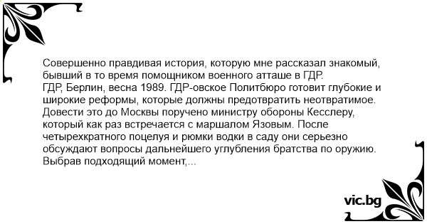 Довести это до Москвы поручено министру обороны Кесслеру, который как раз встречается с маршалом Язовым. После четырехкратного поцелуя и рюмки водки в саду они серьезно обсуждают вопросы дальнейшего углубления братства по оружию. Выбрав подходящий момент, Кесслер вводит тему - Знаете, товарищ маршал, свежий ветер вашей перестройки у нас... Язов прерывает его веселым смехом - знаете, товарищ министр, как поручик Ржевский танцевал с дамой на балу, потом вышел на минутку на улицу, возвращается, а у него штаны забрызганы, она говорит - что, поручик, на улице дождь? а он - да нет, свежий ветер! ХА-ХА-ХА! - Кесслер скомкал беседу и неловко простился ограничившись двукратным поцелуем.