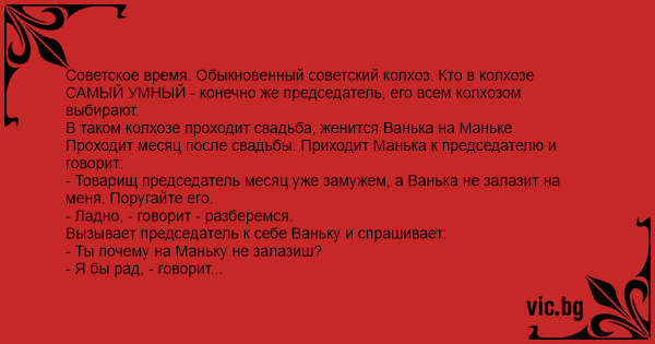 Советское время. Обыкновенный советский колхоз. Кто в колхозе САМЫЙ УМНЫЙ - конечно же председатель, его всем колхозом выбирают. В таком колхозе проходит свадьба, женится Ванька на Маньке. Проходит месяц после свадьбы. Приходит Манька к председателю и говорит: - Товарищ председатель месяц уже замужем, а Ванька не залазит на меня. Поругайте его. - Ладно, - говорит - разберемся. Вызывает председатель к себе Ваньку и спрашивает: - Ты почему на Маньку не залазиш? - Я бы рад, - говорит Ванька - Да не знаю куда совать. Председатель ему: - Вот балбес. Возьми четверть от пупка (и показывает ему рукой сколько) и суй. Вечером Ванька радостный домой прибежал, залезли на печку, он отмерил от пупка сколько председатель показал, но не достал палец до цели, а он куда пальцем ткнул туда и пытается засунуть. Ничего не выходит. Тут ему Манька говорит: - Вань ты пониже возьми. Он размахивается кулаком и хрясь её по морде: - ТЫ ЧТО БОЛЬШЕ ПРЕДСЕДАТЕЛЯ ЗНАЕШЬ?