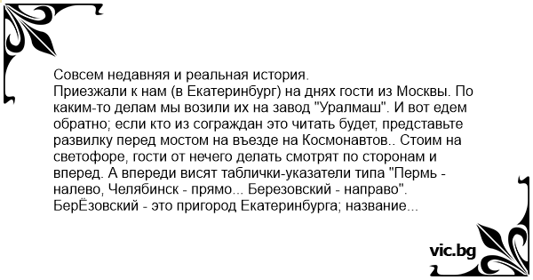 Приезжали к нам (в Екатеринбург) на днях гости из Москвы. По каким-то делам мы возили их на завод "Уралмаш". И вот едем обратно; если кто из сограждан это читать будет, представьте развилку перед мостом на въезде на Космонавтов.. Стоим на светофоре, гости от нечего делать смотрят по сторонам и вперед. А впереди висят таблички-указатели типа "Пермь - налево, Челябинск - прямо... Березовский - направо".