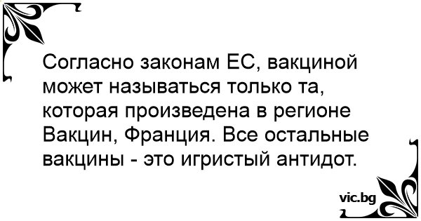 Согласно законам ЕС, вакциной может называться только та, которая произведена в регионе Вакцин, Франция. Все остальные вакцины - это игристый антидот.