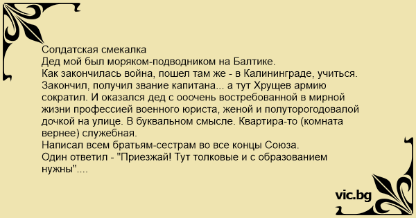 Дед мой был моряком-подводником на Балтике. Как закончилась война, пошел там же - в Калининграде, учиться. Закончил, получил звание капитана... а тут Хрущев армию сократил. И оказался дед с ооочень востребованной в мирной жизни профессией военного юриста, женой и полуторогодовалой дочкой на улице. В буквальном смысле. Квартира-то (комната вернее) служебная. Написал всем братьям-сестрам во все концы Союза. Один ответил - "Приезжай! Тут толковые и с образованием нужны". Долго ли коротко ли, но через десять лет дед получил должность первого секретаря районного исполнительного комитета. Как сейчас начальник управы. Райончик был еще тот - вроде аграрный, но поля родили только камни (последний "ледник" привет оставил). В райцентре - пекарня, мастерская по изготовлению гитар, да две школы с почтой. Здание исполкома - покосившаяся изба. Через год ровно дед поехал в республиканский центр - просить, чтоб поручили строить в райцентре заводы-фабрики. Ему - да у вас даже исполком в избе! а вы - фабрики... И тут дед достал районную "Правду". А там заметка: мол, первое что сделал новый секретарь исполкома, так это велел всем колхозам собранные при пахоте с полей камни не выбрасывать, а по машине отправить в райцентр. И фотка - новое здание исполкома из камней. - Ну раз, солдат, ты себе каменные палаты выправил, то и фабрику построишь! За следующие десять лет в городке построили тракторный завод, оптический, мукомольный, бетонный, больницу, еще две школы....Теперь это симпатичный город на двести тысяч человек. ...про то, что камни пришлось класть самим исполкомовцам с дедом во главе, газета умолчала...да и дед до конца Союза не очень-то распространялся.