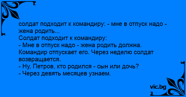 солдат подходит к командиру: - мне в отпуск надо - жена родить...