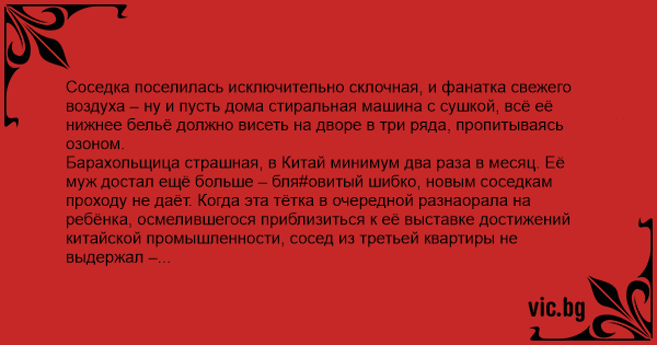 Барахольщица страшная, в Китай минимум два раза в месяц. Её муж достал ещё больше – бля#овитый шибко, новым соседкам проходу не даёт. Когда эта тётка в очередной разнаорала на ребёнка, осмелившегося приблизиться к её выставке достижений