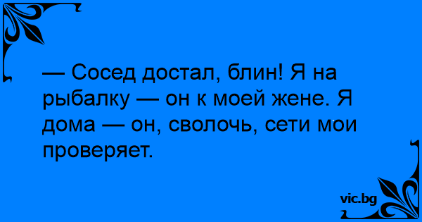 — Сосед достал, блин! Я на рыбалку — он к моей жене. Я дома — он, cboлoчь, сети мои проверяет.
