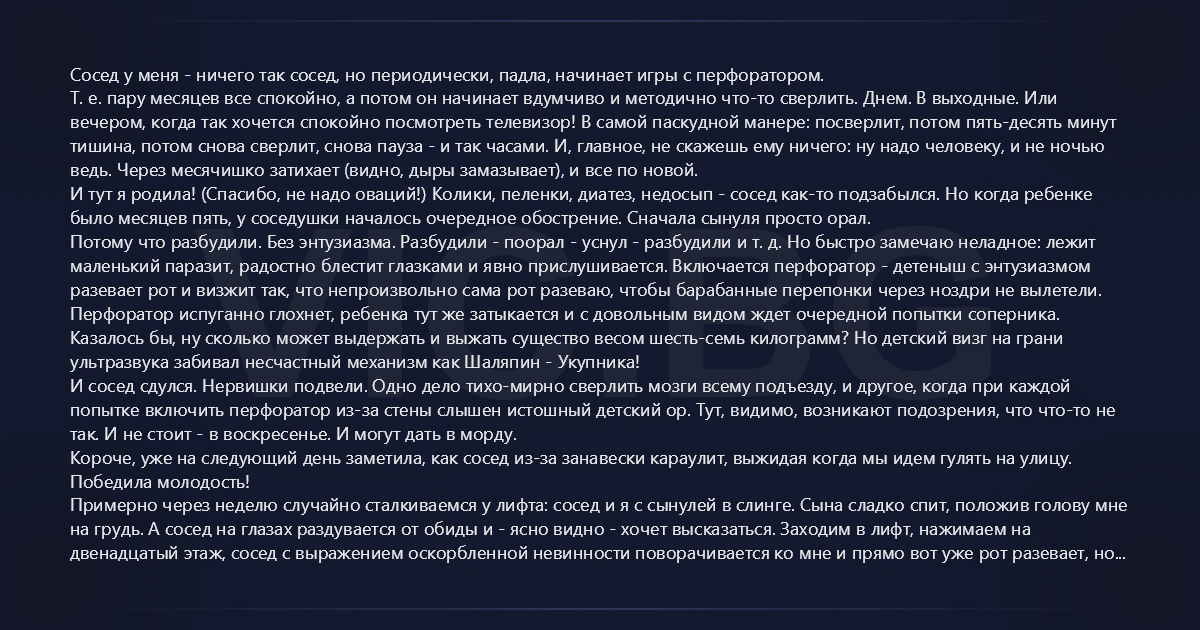 Сосед у меня - ничего так сосед, но периодически, падла, начинает игры с перфоратором. Т. е. пару месяцев все спокойно, а потом он начинает вдумчиво и методично что-то сверлить. Днем. В выходные. Или вечером, когда так хочется спокойно посмотреть телевизор! В самой паскудной манере: посверлит, потом пять-десять минут тишина, потом снова сверлит, снова пауза - и так часами. И, главное, не скажешь ему ничего: ну надо человеку, и не ночью ведь. Через месячишко затихает (видно, дыры замазывает), и все по новой. И тут я родила! (Спасибо, не надо оваций!) Колики, пеленки, диатез, недосып - сосед как-то подзабылся. Но когда ребенке было месяцев пять, у соседушки началось очередное обострение. Сначала сынуля просто орал. Потому что разбудили. Без энтузиазма. Разбудили - поорал - уснул - разбудили и т. д. Но быстро замечаю неладное: лежит маленький паразит, радостно блестит глазками и явно прислушивается. Включается перфоратор - детеныш с энтузиазмом разевает рот и визжит так, что непроизвольно сама рот разеваю, чтобы барабанные перепонки через ноздри не вылетели. Перфоратор испуганно глохнет, ребенка тут же затыкается и с довольным видом ждет очередной попытки соперника. Казалось бы, ну сколько может выдержать и выжать существо весом шесть-семь килограмм? Но детский визг на грани ультразвука забивал несчастный механизм как Шаляпин - Укупника! И сосед сдулся. Нервишки подвели. Одно дело тихо-мирно сверлить мозги всему подъезду, и другое, когда при каждой попытке включить перфоратор из-за стены слышен истошный детский ор. Тут, видимо, возникают подозрения, что что-то не так. И не стоит - в воскресенье. И могут дать в морду. Короче, уже на следующий день заметила, как сосед из-за занавески караулит, выжидая когда мы идем гулять на улицу. Победила молодость! Примерно через неделю случайно сталкиваемся у лифта: сосед и я с сынулей в слинге. Сына сладко спит, положив голову мне на грудь. А сосед на глазах раздувается от обиды и - ясно видно - хочет высказаться. Заходим в лифт, нажимаем на двенадцатый этаж, сосед с выражением оскорбленной невинности поворачивается ко мне и прямо вот уже рот разевает, но тут детка открывает глазки, с ужасом видит прямо перед собой чужого дядьку и... ... Вот боинг на взлете - фигня. Реально. Писк комариный. Только понимаешь это, когда есть с чем сравнивать... Больше перфоратор мы не слышали. И сосед с нами не общается. Он, кажется, левым ухом теперь не слышит, и вроде как глаз у него дергаться стал, но у нас свои проблемы. У нас зубки начали резаться, хе-хе...
