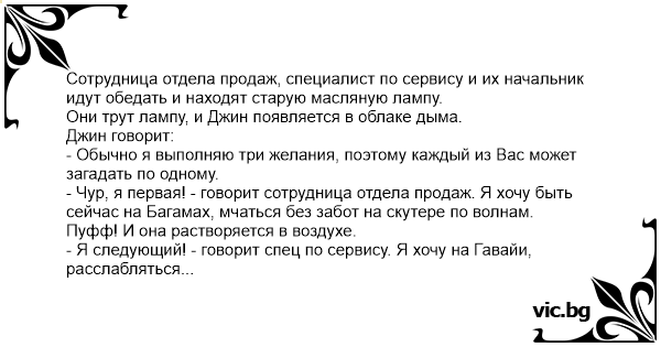 Pardavėjas, sekretorė ir jų šefas eidami pietauti rado senovinę aliejaus lempą. Jie ją patrynė ir lauk išlindo dvasia. - Ačiū, kad mane išleidot... Dabar aš išpildysiu po vieną jūsų norą, - tarė...