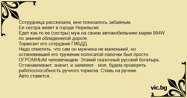 Сотрудница рассказала, мне показалось забавным. Ее сестра живет в городе Норильске. Едет как-то ее (сестры) муж на своем автомобильчике марки BMW по зимней обледенелой дороге. Тормозит его сотрудник ГИБДД. Надо отметить, что сам он мужчина не маленький, но остановивший его труженик полосатой палочки был просто ОГРОМНЫМ человечищем. Этакий сказочный русский богатырь. Останавливает, значит, и заявляет - мол, будем проверять работоспособность ручного тормоза. Ставь на ручник. Авто ставится на ручник, после чего гибддшник подходит к задку машины, слегка его приподнимает и не напрягаясь подталкивает вперед, после чего есс-но заявляет, что ручник не работает Муж вступает в дискуссию - говоря, что на улице гололед, и что, мол с такими данными эту машинку можно вообще на руках носить аки люльку. Мент непоколебим - едет машина и все тут - не работает ручник Пришлось раскошеливаться