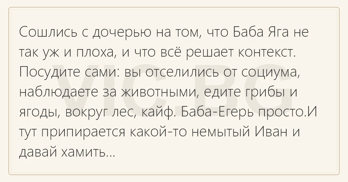 Сошлись с дочерью на том, что Баба Яга не так уж и плоха, и что всё решает контекст. Посудите сами: вы отселились от социума, наблюдаете за животными, едите грибы и ягоды, вокруг лес, кайф. Баба-Егерь просто.И тут припирается какой-то немытый Иван и давай хамить...