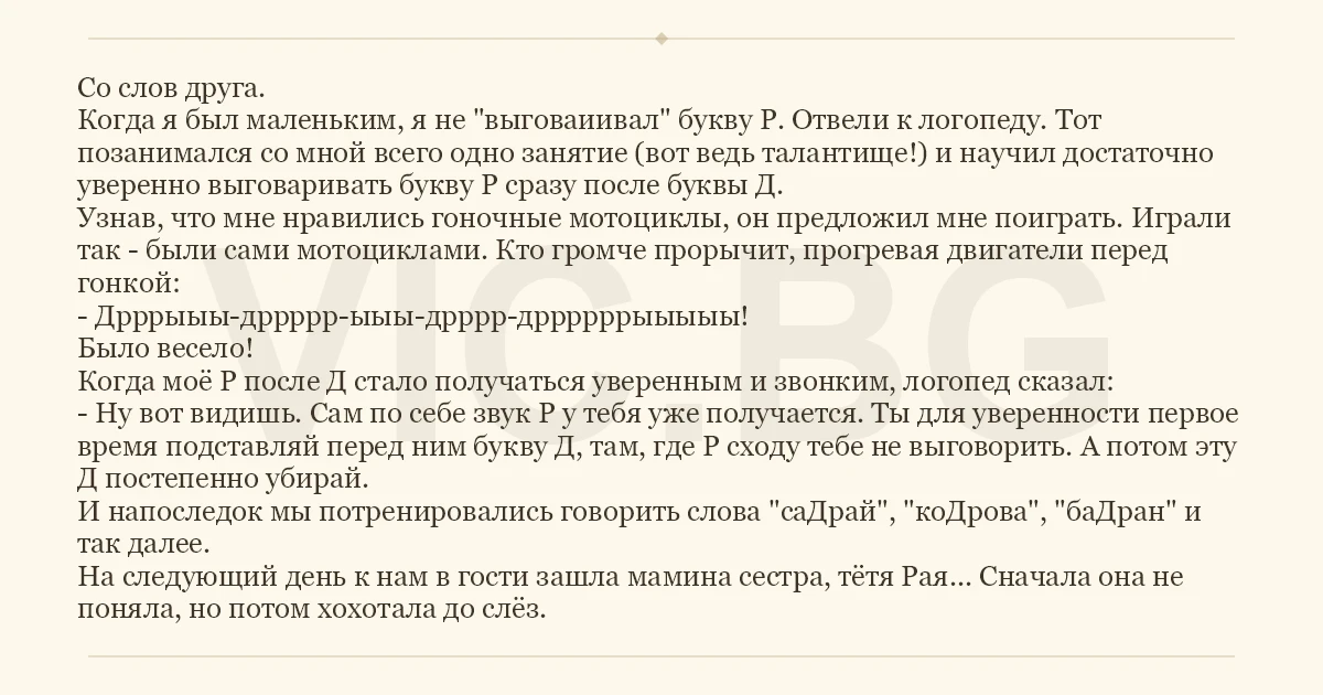 Со слов друга. Когда я был маленьким, я не "выговаиивал" букву Р. Отвели к логопеду. Тот позанимался со мной всего одно занятие (вот ведь талантище!) и научил достаточно уверенно выговаривать букву Р сразу после буквы Д. Узнав, что мне нравились гоночные мотоциклы, он предложил мне поиграть. Играли так - были сами мотоциклами. Кто громче прорычит, прогревая двигатели перед гонкой: - Дрррыыы-дррррр-ыыы-дрррр-дррррррыыыыы! Было весело! Когда моё Р после Д стало получаться уверенным и звонким, логопед сказал: - Ну вот видишь. Сам по себе звук Р у тебя уже получается. Ты для уверенности первое время подставляй перед ним букву Д, там, где Р сходу тебе не выговорить. А потом эту Д постепенно убирай. И напоследок мы потренировались говорить слова "саДрай", "коДрова", "баДран" и так далее. На следующий день к нам в гости зашла мамина сестра, тётя Рая... Сначала она не поняла, но потом хохотала до слёз.