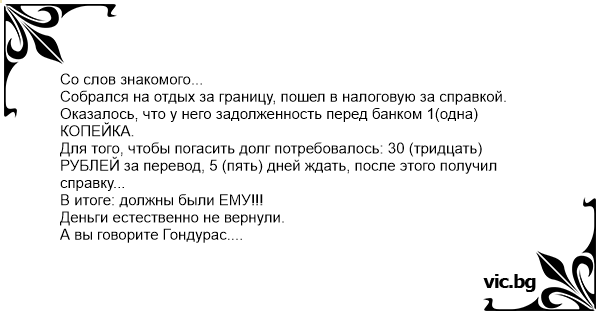 Собрался на отдых за границу, пошел в налоговую за справкой. Оказалось, что у него задолженность перед банком 1(одна) КОПЕЙКА.