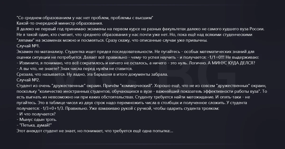 "Со среднем образованием у нас нет проблем, проблемы с высшим" Какой-то очередной министр образования. Я далеко не первый год принимаю экзамены на первом курсе на разных факультетах далеко не самого худшего вуза России. Не я такой один, кто считает, что среднего образования у нас почти уже нет. Но, пока ещё над всякими студенческими "ляпами" на экзаменах можно и посмеяться. Сразу скажу, что описанные случаи уже привычны. Случай №1. Экзамен по матанализу. Студентка ищет предел последовательности. Не пугайтесь - особых математических знаний для оценки ситуации не потребуется. Делает всё правильно - чему-то успел научить - и получается: -1/1=0!!! Не выдерживаю: - Извините, я понимаю, что всё сократилось и ничего не осталось, а ничего - это нуль. Логично. А МИНУС КУДА ДЕЛСЯ? - А вы что, не знаете? Знак числа перед нулём не ставится. Срезала, что называется. Ну ладно, эта барышня в итоге документы забрала. Случай №2. Студент из очень "дружественных" окраин. Причём "коммерческий". Хорошо ещё, что не из совсем "дружественных" окраин, поскольку "количество иностранных студентов, обучающихся в вузе - важнейший показатель эффективности работы вуза". То есть выгнать их невозможно ни при каких обстоятельствах. Студенту требуется найти матожидание. И опять-таки - не пугайтесь. Это в таблице чисел из двух строк надо перемножить числа в столбцах и полученное сложить. У студента получается: -1/3+0+1/3. Правильно. Уже взмахиваю рукой с ручкой, чтобы одарить студента трояком: - И что получается? - Мынус одын трэть. - "Петька, думай!" Этот анекдот студент не знает, но понимает, что требуется ещё одна попытка: - Плус одын трэть. - А если подумать ещё раз? - Нэт вариантов. - А ты слагаемые местами переставь. У меня уже есть дежурная шутка для жертв ЕГЭ: "Почему у вас все равно нулю, кроме тех случаев, когда действительно равно нулю". Это именно тот случай: - Одын треть мынус одын треть. Это, что ноль? А что, так можно было? А в школе было нельзя. - Так это же университет. Тут всё по-взрослому. Тут-можно. И уточню, на всякий случай. Речь идет о естественнонаучных факультетах. В вузе, занимающим разные места даже в зарубежных рейтингах, не говоря уже об отечественных. И ведь таких, блин, студентов у нас не мало.