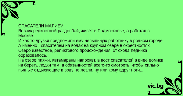 - Вова ты где? Завтрашний экзамен переносится на сегодня, такой вот форс-мажор. Дуй немедленно на пост, сейчас туда экзаменационная комиссия прибудет, осуществим твоё погружение на дно и выпишем тебе квалификацию спасателя.