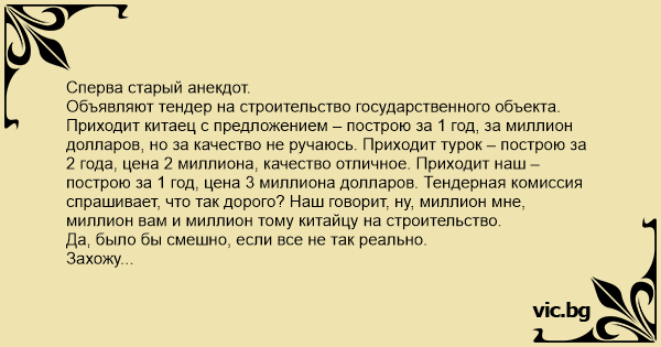 Объявляют тендер на строительство государственного объекта. Приходит китаец с предложением – построю за 1 год, за миллион долларов, но за качество не ручаюсь. Приходит турок – построю за 2 года, цена 2 миллиона, качество отличное. Приходит наш – построю за 1 год, цена 3 миллиона долларов. Тендерная комиссия спрашивает, что так дорого? Наш говорит, ну, миллион мне, миллион вам и миллион тому китайцу на строительство.