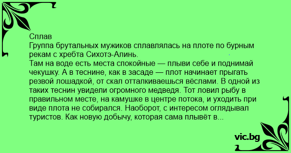 Группа брутальных мужиков сплавлялась на плоте по бурным рекам с хребта Сихотэ-Алинь. Там на воде есть места спокойные — плыви себе и поднимай чекушку. А в теснине, как в засаде — плот начинает прыгать резвой лошадкой, от скал отталкиваешься вёслами. В одной из таких теснин увидели огромного медведя. Тот ловил рыбу в правильном месте, на камушке в центре потока, и уходить при виде плота не собирался. Наоборот, с интересом оглядывал туристов. Как новую добычу, которая сама плывёт в лапы. Рассматривать медвежью морду в упор не хотелось никому, а плот уже несло. В состоянии аффекта мужик, оказавшийся к медведю ближе всех, схватил увесистый рюкзак и стал им грозно размахивать. Никакого впечатления на медведя это не произвело. Приблизившись, мужик изо всех сил попытался огреть медведя рюкзаком по башке. Тот изумился и бросился бежать. Он издавал при этом какие-то похожие на собачий лай, но в целом возмущённые звуки. На спокойной воде мужик огляделся и заметил, что остальные, все бывалые охотники, сидят смертельно бледные. - Ну что, обо.рались!!? — торжествующе воскликнул он. - Ага! — признался один из них — Я думал, ты рюкзак швырнуть в медведя собираешься. А там вся наша водка, да мы тебя сами загрызли бы.