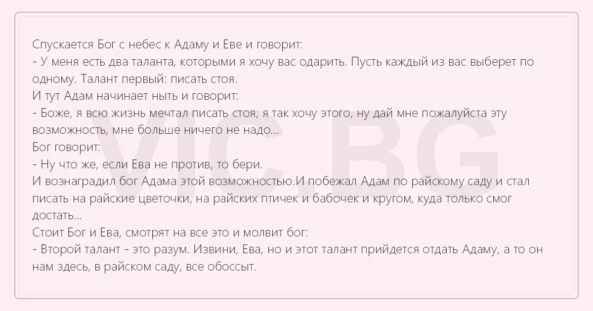 Спускается Бог с небес к Адаму и Еве и говорит: - У меня есть два таланта, которыми я хочу вас одарить. Пусть каждый из вас выберет по одному. Талант первый: писать стоя. И тут Адам начинает ныть и говорит: - Боже, я всю жизнь мечтал писать стоя, я так хочу этого, ну дай мне пожалуйста эту возможность, мне больше ничего не надо... Бог говорит: - Ну что же, если Ева не против, то бери. И вознаградил бог Адама этой возможностью.И побежал Адам по райскому саду и стал писать на райские цветочки, на райских птичек и бабочек и кругом, куда только смог достать... Стоит Бог и Ева, смотрят на все это и молвит бог: - Второй талант - это разум. Извини, Ева, но и этот талант прийдется отдать Адаму, а то он нам здесь, в райском саду, все обоссыт.