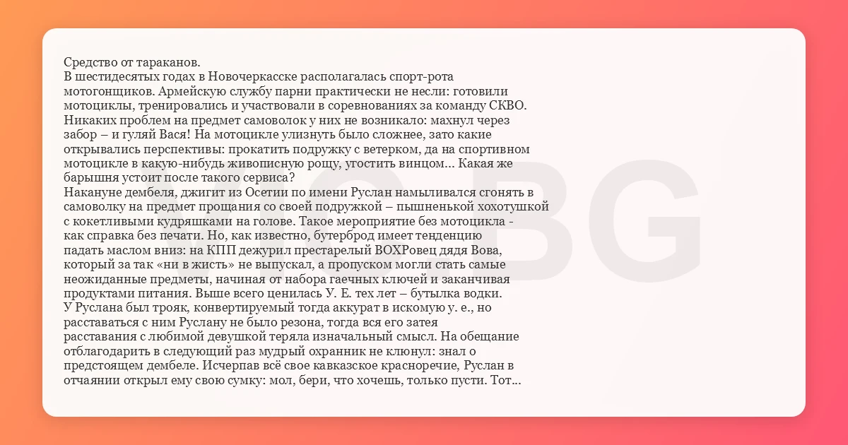 Средство от тараканов. В шестидесятых годах в Новочеркасске располагалась спорт-рота мотогонщиков. Армейскую службу парни практически не несли: готовили мотоциклы, тренировались и участвовали в соревнованиях за команду СКВО. Никаких проблем на предмет самоволок у них не возникало: махнул через забор – и гуляй Вася! На мотоцикле улизнуть было сложнее, зато какие открывались перспективы: прокатить подружку с ветерком, да на спортивном мотоцикле в какую-нибудь живописную рощу, угостить винцом... Какая же барышня устоит после такого сервиса? Накануне дембеля, джигит из Осетии по имени Руслан намыливался сгонять в самоволку на предмет прощания со своей подружкой – пышненькой хохотушкой с кокетливыми кудряшками на голове. Такое мероприятие без мотоцикла - как справка без печати. Но, как известно, бутерброд имеет тенденцию падать маслом вниз: на КПП дежурил престарелый ВОХРовец дядя Вова, который за так «ни в жисть» не выпускал, а пропуском могли стать самые неожиданные предметы, начиная от набора гаечных ключей и заканчивая продуктами питания. Выше всего ценилась У. Е. тех лет – бутылка водки. У Руслана был трояк, конвертируемый тогда аккурат в искомую у. е., но расставаться с ним Руслану не было резона, тогда вся его затея расставания с любимой девушкой теряла изначальный смысл. На обещание отблагодарить в следующий раз мудрый охранник не клюнул: знал о предстоящем дембеле. Исчерпав всё свое кавказское красноречие, Руслан в отчаянии открыл ему свою сумку: мол, бери, что хочешь, только пусти. Тот внимательно изучил её содержимое, и неожиданно его заинтересовал незнакомый предмет, напоминающий новогоднюю хлопушку. «Это эффективнейшее средство от тараканов», – охотно пояснил Руслан, почувствовав, что клиент клюнул на пустяковую приманку. «А эта фигня на клопов действует?» – всё ещё колебался охранник. «А как же, на клопов, блох и даже на муравьев. Да я вам завтра инструкцию принесу. Надо поджечь фитиль, оставить эту штуку на полу и выйти из комнаты. А через пять минут проветрить помещение». Сделка состоялась, и на следующее утро Руслан вольной птицей упорхнул в свою горную республику. А через полгода на очередных соревнованиях он встретился со своими бывшими сослуживцами и узнал, как дядя Вова распорядился «патентованным» средством от насекомых. Он, в полном соответствии с устной Руслана инструкцией, поджёг фитиль «хлопушки» и вышел из избы. Рвануло так, что из окон осыпались стёкла, и проветривать помещение отпала необходимость. Да и клопы с тараканами наверняка окочурились от взрывной волны. «Хлопушкой» оказался учебный взрывпакет, нечто похожее на теперешнюю петарду, но в десятки раз мощнее. Охранник шума поднимать не стал, чтобы не всплыли его поборы, но с тех пор выпускать ребят без необходимых документов перестал.
