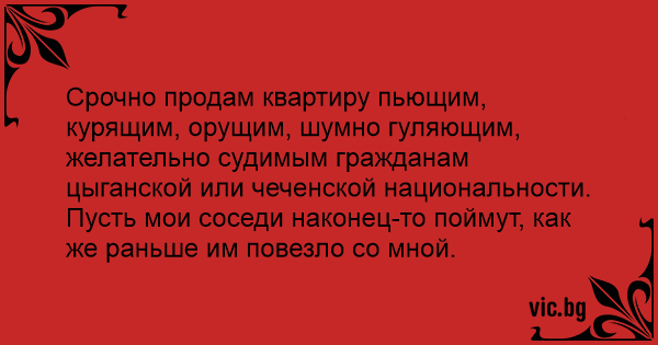 Срочно продам квартиру пьющим, курящим, орущим, шумно гуляющим, желательно судимым гражданам цыганской или чеченской национальности.