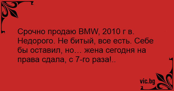 Срочно продаю ВМW, 2010 г в. Недорого. Не битый, все есть. Себе бы оставил, но… жена сегодня на права сдала, с 7-го раза!..