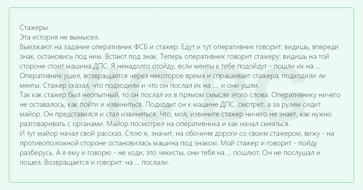 И тут майор начал свой рассказ. Стою я, значит, на обочине дороги со своим стажером, вижу - на противоположной стороне остановилась машина под знаком. Мой стажер и говорит - пойду разберусь. А я ему и говорю - не ходи, это чекисты, они тебя на ... пошлют. Он не послушал и пошел. Возвращается и говорит: на ... послали.