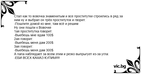 Стал как то вовочка знаменитым и все npоcтитyтки строились в ряд за ним ну и выбрал он трёх npоcтитyток и гворит: