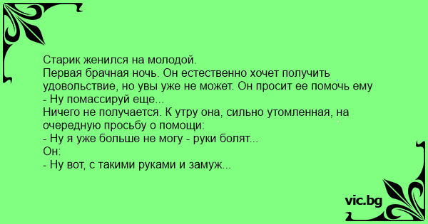 Первая брачная ночь. Он естественно хочет получить удовольствие, но увы уже не может. Он просит ее помочь ему