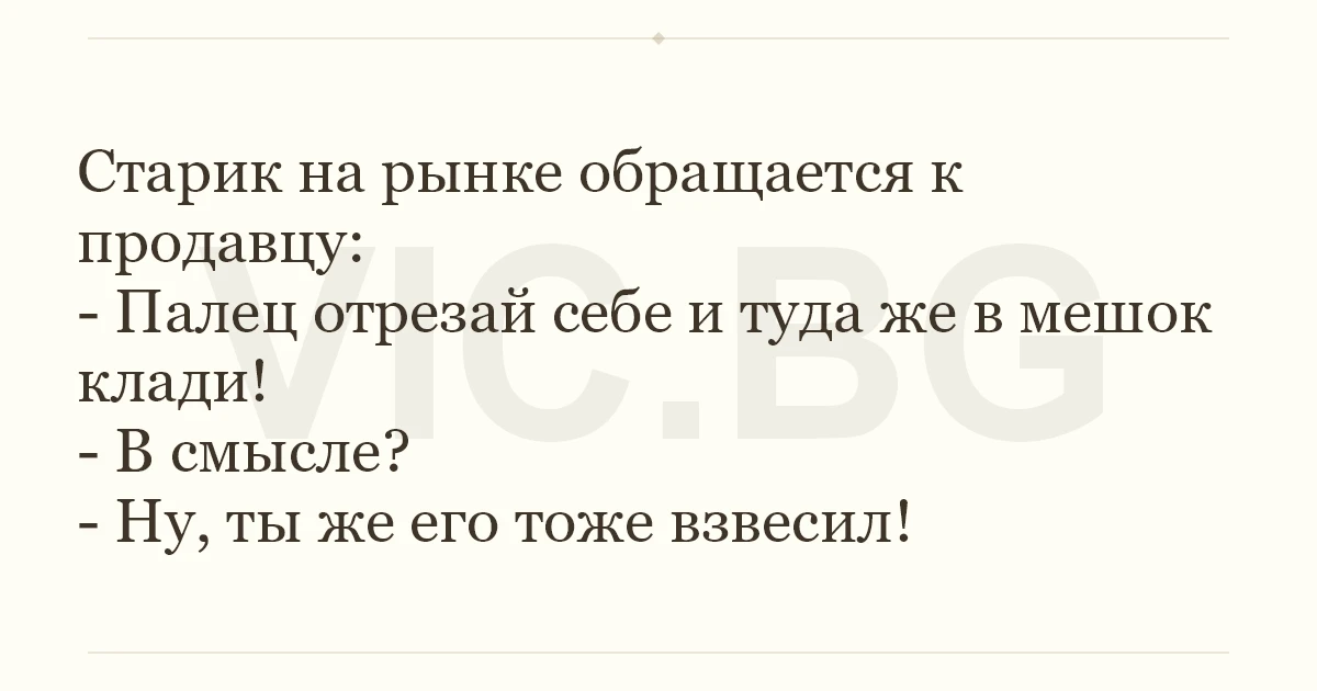 Старик на рынке обращается к продавцу: - Палец отрезай себе и туда же в мешок клади! - В смысле? - Ну, ты же его тоже взвесил!