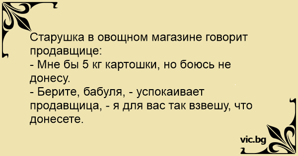 - Берите, бабуля, - успокаивает продавщица, - я для вас так взвешу, что донесете.