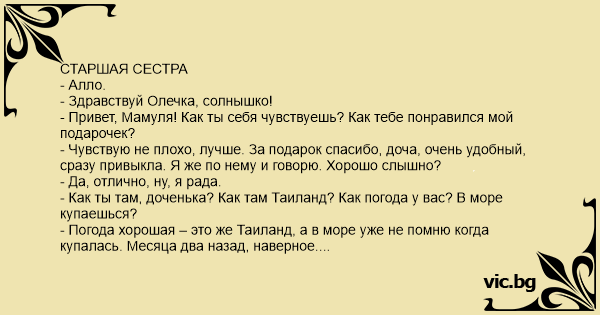 - Как ты там, доченька? Как там Таиланд? Как погода у вас? В море купаешься?