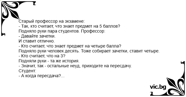 Старый профессор на экзамене: - Так, кто считает, что знает предмет на 5 баллов? Подняло руки пара студентов. Профессор: - Давайте зачетки. И ставит отлично. - Кто считает, что знает предмет на четыре балла? Подняло руки человек десять. Тоже собирает зачетки, ставит четыре. - Кто считает, что на 3? Подняли руки - та же история. - Значит, так - остальные неуд, приходите на пересдачу. Студент: - А когда пересдача? Профессор: - Ну-у-у, давайте сейчас. Итак! Кто считает, что знает предмет на 5 баллов?