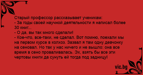 - Кое-что, все-таки, не сделал. Вот помню, поехали мы на первом курсе в колхоз. Зазвал я там одну девчонку на сеновал. Но так у нас ничего и не вышло: она все время в сено проваливалась. Эх, взять бы все эти чертовы книги да сунуть ей тогда под задницу!