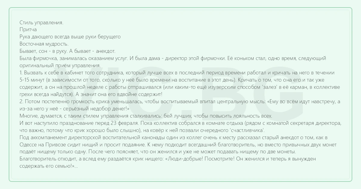 Стиль управления. Притча Рука дающего всегда выше руки берущего Восточная мудрость. Бывает, сон - в руку. А бывает - анекдот. Была фирмочка, занималась оказанием услуг. И была дама - директор этой фирмочки. Её коньком стал, одно время, следующий оригинальный приём управления. 1. Вызвать к себе в кабинет того сотрудника, который лучше всех в последний период времени работал и кричать на него в течении 5-15 минут (в зависимости от того, сколько у неё было времени на воспитание в этот день). Кричать о том, что она его и так уже содержит, а он на прошлой неделе с работы отпрашивался (или каким-то ещё изуверским способом 'залез' в её карман, в коллективе грехи всегда найдутся). А значит она его вдвойне содержит! 2. Потом постепенно громкость крика уменьшалась, чтобы воспитываемый впитал центральную мысль: «Ему во всём идут навстречу, а из-за него у неё - серьёзный недобор денег!» Многие, думается, с таким стилем управления сталкивались: бей лучших, чтобы повысить лояльность всех. И вот наступило празднование перед 23 февраля. Пока коллектив собрался в комнате отдыха (рядом с комнатой секретаря директора, что важно, потому что крик хорошо было слышно), на ковёр к ней позвали очередного 'счастливчика'. Под аккомпанемент директорской воспитательной канонады один из коллег очень к месту рассказал старый анекдот о том, как в Одессе на Привозе сидит нищий и просит подаяние. К нему подходит всегдашний благотворитель, но вместо привычных двух монет подаёт нищему только одну. После чего поясняет, что он женился и уже не может подавать нищему по две монеты. Благотворитель отходит, а вслед ему раздаётся крик нищего: «Люди-добрые! Посмотрите! Он женился и теперь я вынужден содержать его семью!» В этот момент в комнату 'вваливается' только что 'пропаренный' сотрудник (по роковому стечению обстоятельств его грех состоял в том, что он только что женился и брал лишнюю неделю отпуска без оплаты, и за него работал его всегдашний напарник). Все поворачиваются к нему с вопросом: «Ну, как?» И под понимающие взгляды коллег он дал очень к месту ответ: «Кричала, что она вынуждена содержать мою семью! А разве вы это не слышали? Чего смеялись-то?» Повторный хохот потряс стены комнаты отдыха и стал началом месячника подачи заявлений об увольнении. Не меньше половины бывшего коллектива, под руководством того самого «пропаренного», создала конкурирующую фирмочку. Кстати, вполне успешную.