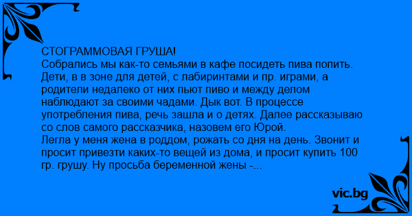 СТОГРАММОВАЯ ГРУША! Собрались мы как-то семьями в кафе посидеть пива попить. Дети, в в зоне для детей, с лабиринтами и пр. играми, а родители недалеко от них пьют пиво и между делом наблюдают за своими чадами. Дык вот. В процессе употребления пива, речь зашла и о детях. Далее рассказываю со слов самого рассказчика, назовем его Юрой. Легла у меня жена в роддом, рожать со дня на день. Звонит и просит привезти каких-то вещей из дома, и просит купить 100 гр. грушу. Ну просьба беременной жены - это святое. Заехал домой собрал вещей и поехал на овощной рынок за грушей. Бедные девки на рынке. Прошу грушу 100 гр., взвешивают - 250, большая. Говорю, что меньше надо, а мне в ответ, "нету меньше". Долго бродил, в итоге устал, но нашел 117 гр. Про себя думаю, фиг с ним 17 гр. откушу, а 100 жене отдам. Приезжаю в роддом, отдаю жене вещи и пр. Она спрашивает: - Грушу купил? - Да, вот. Но здесь 117 гр. пойдет? "Достаю в довольной улыбке, что нашел." Смотрю палата начинает тихо смеяться, потом жена. Потом ржали пока слезы не пошли. Один я стою и не пойму, что случилось. - Дуpak, ты что мне купил. Я тебя просила "медицинскую грушу", клизму. А ты мне? Тут до меня доходит и начинаю рыдать уже я. Потом как приходил в роддом, посмотреть на ребенка и навестить жену. В палате просто при виде меня, уже начинали ржать. А нужную грушу я все-таки купил, правда 100 гр. не было. Были 90 и 130, пришлось 130 купить. ЗЫ Привет из Башкирии.