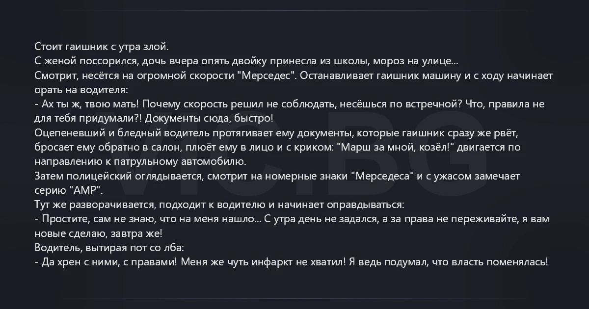Стоит гаишник с утра злой. С женой поссорился, дочь вчера опять двойку принесла из школы, мороз на улице... Смотрит, несётся на огромной скорости "Мерседес". Останавливает гаишник машину и с ходу начинает орать на водителя: - Ах ты ж, твою мать! Почему скорость решил не соблюдать, несёшься по встречной? Что, правила не для тебя придумали?! Документы сюда, быстро! Оцепеневший и бледный водитель протягивает ему документы, которые гаишник сразу же рвёт, бросает ему обратно в салон, плюёт ему в лицо и с криком: "Марш за мной, козёл!" двигается по направлению к патрульному автомобилю. Затем полицейский оглядывается, смотрит на номерные знаки "Мерседеса" и с ужасом замечает серию "АМР". Тут же разворачивается, подходит к водителю и начинает оправдываться: - Простите, сам не знаю, что на меня нашло... С утра день не задался, а за права не переживайте, я вам новые сделаю, завтра же! Водитель, вытирая пот со лба: - Да хpeн с ними, с правами! Меня же чуть инфаркт не хватил! Я ведь подумал, что власть поменялась!