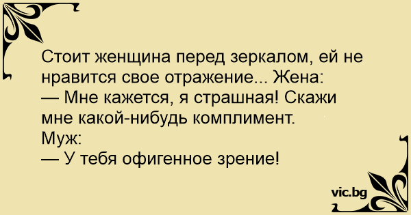 Ένα ζευγάρι Пред огледалото: Стои една жена пред огледалото и казва на мъжа си: Schatz, ich fühle mich heute so dick und gar nicht hübsch. Kannst du mir nicht ein Kompliment machen. Minha namorada estava nua na frente de um espelho e ela não estava feliz com o que via. Un matrimonio ya acostándose al final del día. Une femme dit à son mari : Η σύζυγος κοιτάζει τον εαυτό της μπροστά στον καθρέπτη. This woman rushed to see her doctor, looking very much worried and all strung out. She rattles off: "Doctor, take a look at me. When I woke up this morning, I looked at myself in the mirror and saw my hair all wiry and frazzled up, my skin was all wrinkled and pasty, my eyes were bloodshot and... Une femme nue, se regarde debout devant la glace, elle dit à son époux : "Je me trouve horrible à regarder, grasse et ridée... J'ai besoin d'un compliment" Le mari répond : "Tu as une bonne vue !" Eine etwas in die Jahre gekommene Frau steht vor dem zu Bett gehen nackt vor dem Spiegel, lässt ihren Blick am Spiegelbild rauf und runter wandern und meint dann seufzend zu ihrem Mann: "Wenn ich... A woman is standing looking in the bedroom mirror… She is not happy with what she sees and says to her husband, “I feel horrible; I look old, fat and ugly… I really need you to pay me a... Mijn vrouw bekeek  zich in de spiegel en was niet tevreden met wat ze daar zag. Ik voel me verschrikkelijk, ik vind me oud,dik en lelijk. Ik heb het nodig dat je me onmiddellijk een compliment... Een koppel maakt zich klaar om te gaan slapen. De vrouw staat voor haar grote spiegel, en ze zegt: "Schatje, in de spiegel zie ik een oude vrouw. Mijn gezicht is vol rimpels, ik krijg al wat snor,... Due amici parlano del loro San Valentino. Uno racconta all'altro: "Ieri sera io e mia moglie dovevamo andare a cena fuori: avevo prenotato per le otto ed erano già le otto e un quarto quando lei... "Schatz?" "Ja?" "Ich fühle mich so hässlich, so fett und so faltig. Ich brauche ein Kompliment." "Du hast eine gute Beobachtungsgabe." A mulher esta nua, olhando no espelho do quarto de dormir. Ela não está feliz com o que vê e diz para o marido: — Sinto-me horrível. Pareço velha, gorda e feia... Eu realmente preciso de um elogio... A woman was standing naked, looking herself at the mirror. She was not satisfied with what she was looking at and said to her husband: "I feel awful. I look old, fat, and ugly. I really need a... Toen mijn vrouw in de spiegel keek zei ze: “Ik begin dik, oud en lelijk te worden, kan je me een compliment geven?” Dus ik antwoordde: “Je ogen zijn toch nog prima” O Marido chega para a esposa: " estou tão velho, feio, trite, gordo...preciso de um elogio." Ela: "Você tem uma ótima visão!" Kona står naken og ser seg selv i speilet. Hun sier til mannen: "Jeg er gammel, fet og stygg. Kan du ikke gi meg et kompliment?" Mannen: "Jo synet ditt er perfekt..." En kone sto foran speilet og så på seg selv. Hun var ikke fornøyd med det hun så og sa til mannen: - Jeg føler meg helt forferdelig, jeg ser så gammel og stygg ut. Jeg trenger virkelig at du gir... Kobita budzi się rano po Sylwestrze, patrzy w lustro i szturcha w bok wymęczonego imprezą męża: - Wiesz kochanie, jaka ja już jestem stara! Twarz mam całą pomarszczoną, biust obwisły, oczy sine i... Kobieta w kwiecie wieku staje przed lustrem i mówi do męża: - Ech... przybyło mi zmarszczek, utyłam, te włosy takie jakieś nijakie. Zbrzydłam. Powiedz mi kochanie, coś miłego... - Wzrok masz dalej... Kadın aynaya baktı ve kocasına dönüp: - Kendimi iğrenç buluyorum, çirkin ve yaşlanmış. Güzel bir iltifatına ihtiyacım var. Kocası: - Gözlerin çok iyi görüyor canım. En kvinna stod naken framför sovrumsspegeln. Hon var inte glad åt vad hon såg och sade till sin make: "Jag känner mig förfärlig. Jag ser gammal, fet och ful ut.Jag skulle verkligen behöva en... Ea: Iubitule, ma uit in oglinda si vad o femeie grasa si ridata, am urgent nevoie de un compliment... El: Ai o vedere excelenta! Marito e moglie in camera da letto. Lui è nel letto che sta leggendo il giornale, lei si guarda allo specchio davanti, di dietro, di fianco e poi dice al marito: "Amore mi vedo tanto grassa, sono... Une femme dit a son mari: - Cheri je me sens vieille, ridée et grosse. Fais moi un compliment. Le mari répond: - Tu sais quoi tu as une très bonne vue! Стоїть жінка перед дзеркалом, їй не подобається своє відображення ... Дружина: — Мені здається я страшна! Скажи мені який-небудь комплімент. Чоловік: — У тебе відмінний зір! Une femme se regarde dans le miroir : - Ah regarde comment je suis grasse et laide, j'ai vraiment besoin d'un compliment ! - Félicitation, tu as une éxélente vue ! Sieva stāv pie spoguļa, pēta sevi.. - Dārgais es esmu briesmīga! Pasaki kādu komplimentu… - Mīļā tev ir lieliska redze. Η γυναίκα μου στεκόνταν γυμνή μπροστά στον καθρέφτη και μου λέει: - Αισθάνομαι χάλια. Δείχνω γριά, χοντρή και άσχημη. Πες μου κάτι θετικό. Και της απάντησα: - Η όρασή σου όμως είναι τέλεια… Και... Az öregedő feleség áll a tükör előtt: - Jaj Istenem, teli vagyok ráncokkal, a mellem lecsüng a derekamig, a fenekem megereszkedett, egyre jobban őszülök... Erre a férj: - Drágám, viszont a látásod...