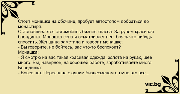 Останавливается автомобиль бизнес класса. За рулем красивая блондинка. Монашка села и осматривает нее, боясь что нибудь спросить. Женщина заметила и говорит монашке: