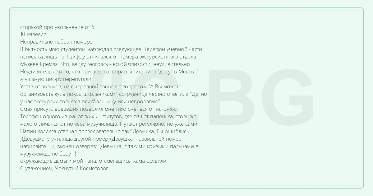 сторькой про увольнение от 6. 10 навеяло... Неправильно набран номер... В бытность мою студентом наблюдал следующее. Телефон учебной части психфака лишь на 1 цифру отличался от номера экскурсионного отдела Музеев Кремля. Что, ввиду географической близости, неудивительно. Неудивительно и то, что при верстке справочника типа "досуг в Москве" эту самую цифру перепутали. Устав от звонков, на очередной звонок с вопросом "А Вы можете организовать культпоход школьникам?" сотрудница честно ответила "Да, но у нас экскурсии только в психбольницу или неврологию". Смех присутствовавших позволил мне тихо смыться от нагоняя... Телефон одного из рановских институтов, где пашет папенька, столь же мало отличался от номера музучилища. Путают регулярно, но уже сами. Папин коллега отвечал последовательно так:"Девушка, Вы ошиблись. )(Девушка, у училища другой номер)(Девушка, правильней номер набирайте... и, вконец озверев: "Девушка, с такими кривыми пальцами в музучилище не берут!!!" окружающие дамы и мой папа, отсмеявшись, хама осудили. С уважением, Чокнутый Косметолог