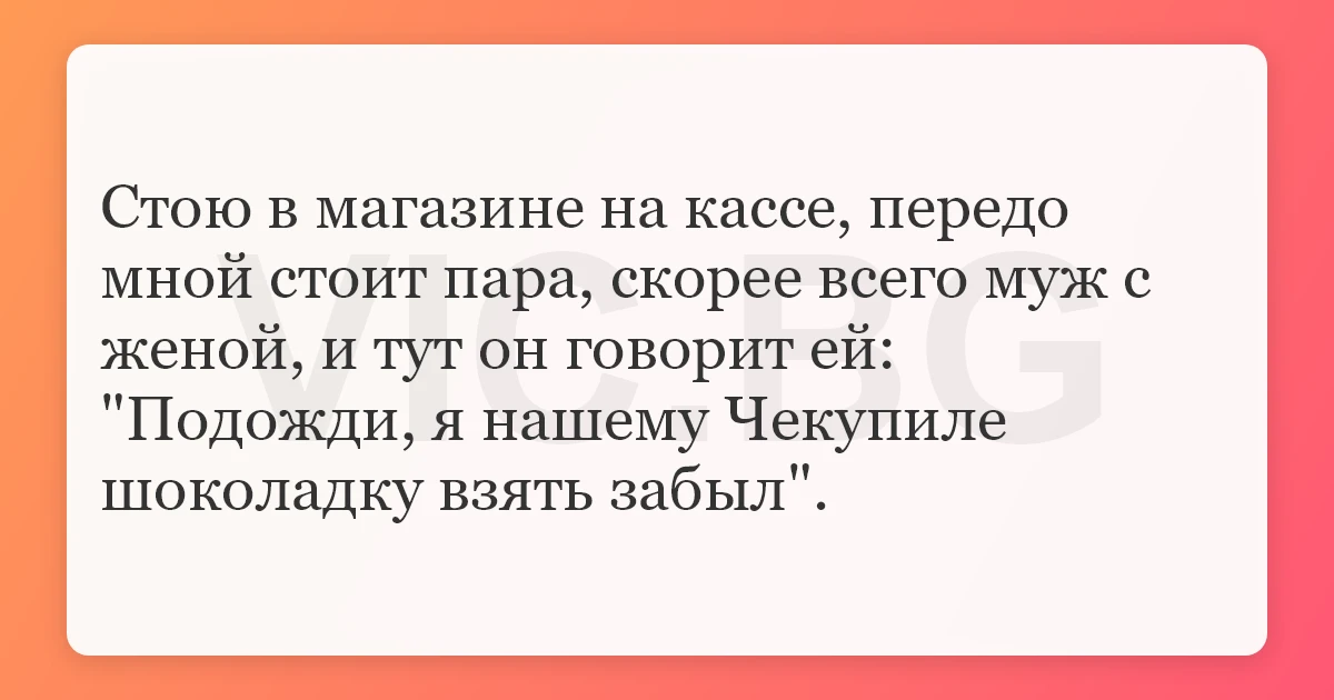 Стою в магазине на кассе, передо мной стоит пара, скорее всего муж с женой, и тут он говорит ей: "Подожди, я нашему Чекупиле шоколадку взять забыл".