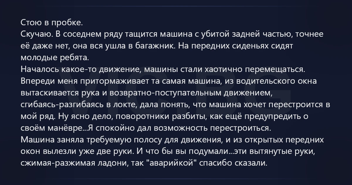 Машина заняла требуемую полосу для движения, и из открытых передних окон вылезли уже две руки. И что бы вы подумали...эти вытянутые руки, сжимая-разжимая ладони, так "аварийкой" спасибо сказали.