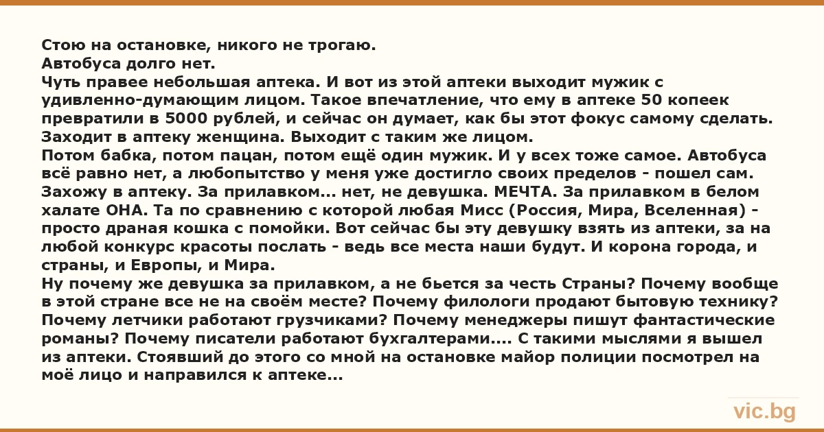 Стою на остановке, никого не трогаю. Автобуса долго нет. Чуть правее небольшая аптека. И вот из этой аптеки выходит мужик с удивленно-думающим лицом. Такое впечатление, что ему в аптеке 50 копеек превратили в 5000 рублей, и сейчас он думает, как бы этот фокус самому сделать. Заходит в аптеку женщина. Выходит с таким же лицом. Потом бабка, потом пацан, потом ещё один мужик. И у всех тоже самое. Автобуса всё равно нет, а любопытство у меня уже достигло своих пределов - пошел сам. Захожу в аптеку. За прилавком... нет, не девушка. МЕЧТА. За прилавком в белом халате ОНА. Та по сравнению с которой любая Мисс (Россия, Мира, Вселенная) - просто драная кошка с помойки. Вот сейчас бы эту девушку взять из аптеки, за на любой конкурс красоты послать - ведь все места наши будут. И корона города, и страны, и Европы, и Мира. Ну почему же девушка за прилавком, а не бьется за честь Страны? Почему вообще в этой стране все не на своём месте? Почему филологи продают бытовую технику? Почему летчики работают грузчиками? Почему менеджеры пишут фантастические романы? Почему писатели работают бухгалтерами.... С такими мыслями я вышел из аптеки. Стоявший до этого со мной на остановке майор полиции посмотрел на моё лицо и направился к аптеке...
