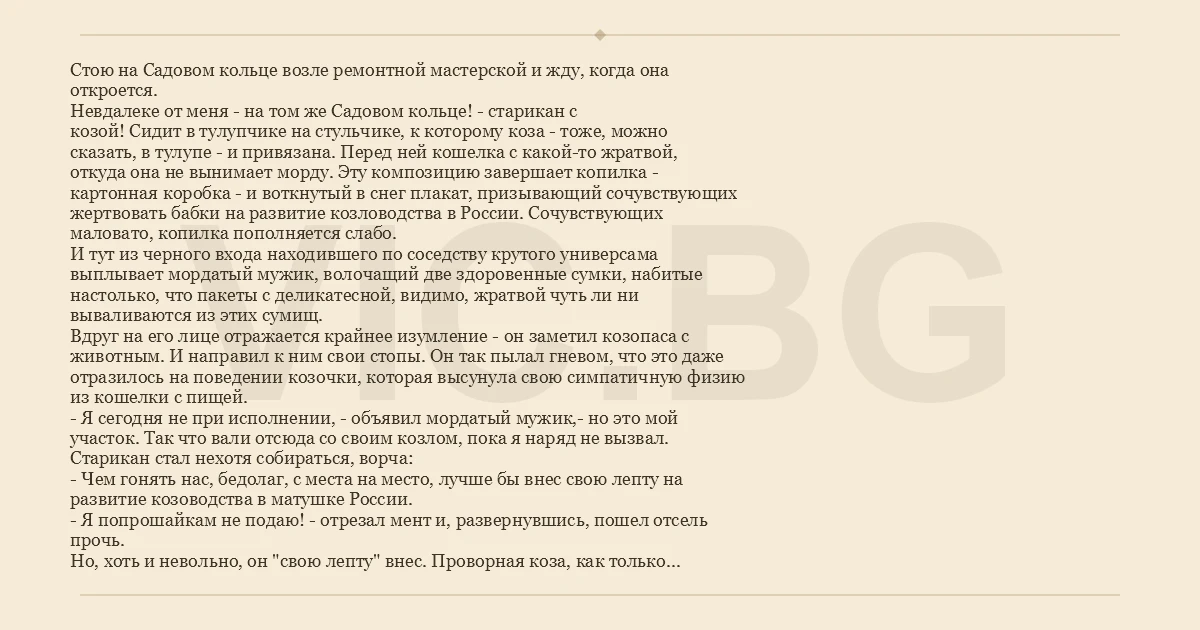 Стою на Садовом кольце возле ремонтной мастерской и жду, когда она откроется. Невдалеке от меня - на том же Садовом кольце! - старикан с козой! Сидит в тулупчике на стульчике, к которому коза - тоже, можно сказать, в тулупе - и привязана. Перед ней кошелка с какой-то жратвой, откуда она не вынимает морду. Эту композицию завершает копилка - картонная коробка - и воткнутый в снег плакат, призывающий сочувствующих жертвовать бабки на развитие козловодства в России. Сочувствующих маловато, копилка пополняется слабо. И тут из черного входа находившего по соседству крутого универсама выплывает мордатый мужик, волочащий две здоровенные сумки, набитые настолько, что пакеты с деликатесной, видимо, жратвой чуть ли ни вываливаются из этих сумищ. Вдруг на его лице отражается крайнее изумление - он заметил козопаса с животным. И направил к ним свои стопы. Он так пылал гневом, что это даже отразилось на поведении козочки, которая высунула свою симпатичную физию из кошелки с пищей. - Я сегодня не при исполнении, - объявил мордатый мужик,- но это мой участок. Так что вали отсюда со своим козлом, пока я наряд не вызвал. Старикан стал нехотя собираться, ворча: - Чем гонять нас, бедолаг, с места на место, лучше бы внес свою лепту на развитие козоводства в матушке России. - Я попрошайкам не подаю! - отрезал мент и, развернувшись, пошел отсель прочь. Но, хоть и невольно, он "свою лепту" внес. Проворная коза, как только мент повернулся к ней задом, выхватила у него из сумки какой-то объемистый пакет и сразу же приступила к вскрытию. Мент ничего не почувствовал и почухал дальше. Хозяин козы благоразумно промолчал. А я почему-то исполнился уверенностью в светлом будущем козловодства в России.
