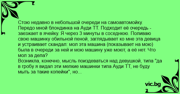 Передо мной блондинка на Ауди ТТ. Подходит её очередь - заезжает в ячейку. Я через 3 минуты в соседнюю. Поливаю свою машинку обильной пеной, заглядывает ко мне эта девица и устраивает скандал: мол эта машина (показывает на мою) была в очереди за ней и мою машину уже моют, а её нет. Что мол за дела?